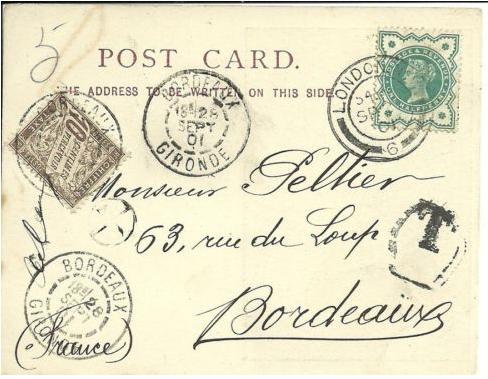 This cute postcard was sent to France with a 1/2d green, but was declared underpaid by 5c (equivalent to 1/2d) on arrival and taxed with a 10c French postage due (which includes a 5c fine). I was very happy to only pay £4.10.