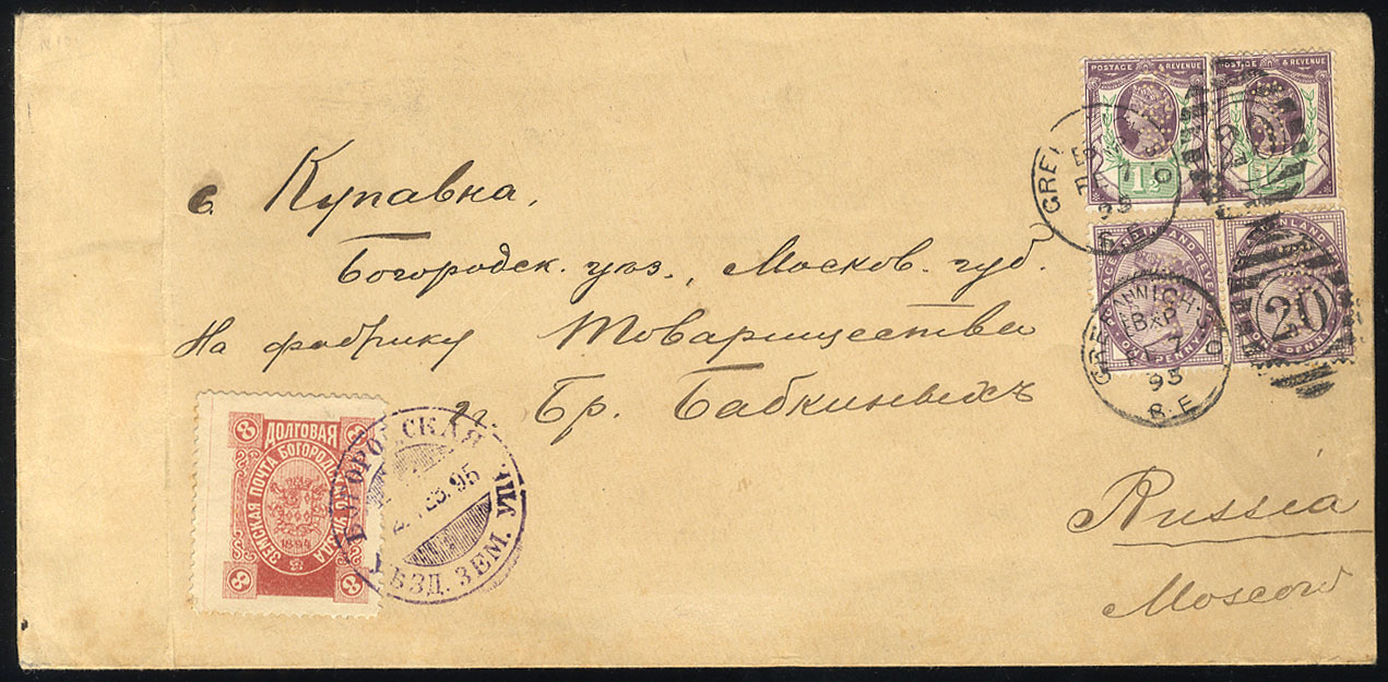 Lot 2020 was sent from Cornholme with 1/2d vermilion paying the printed matter rate. It was sent to Bogoslov volost in Bogorodsk district, via Moscow (1 July) to the Zemstvo Head Post Office (5 July), where 2k yellow brown Zemstvo was added. Once from none other than the Fabergé collection, this cover is apparently the only known example of printed matter rate from England to Bogorodsk, and is illustrated in “Imperial Russia Zemstvo Post”. Estimate: $2’900.