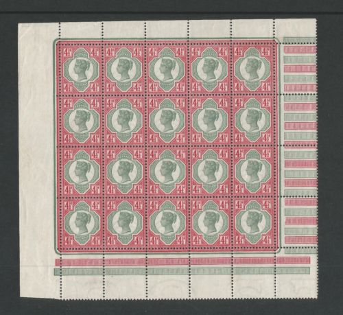 These panes of 20 of the 4 1/2d are fairly common, but very attractive. If you want one, hold out for a perfect pane with no creases and mnh. This very fine example one sold for £206.50 and is the right price. As is the theme of this month, look out for the catalogued plate varieties for extra interest.