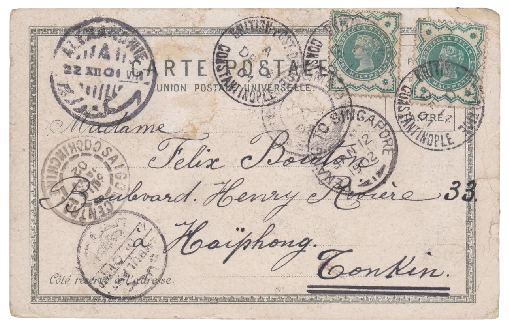 This is a cover I missed out on for my own collection. This postcard was sent from the British Post Office in Constantinople via Alexandria and Singapore to Saigon in Cochinchine (modern day Vietnam). Although the condition isn’t great, it’s a rare destination and especially attractive with the transit markings. It sold for only £35.09.