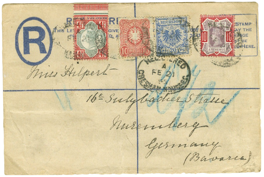 So hopefully now that I have discovered this new web tool that removes the backgrounds rather easily from my images, you will all notice how professional my images look now! First up we have this unusual and attractive philatelic franking with a 4 1/2d red & green and a 10d purple & red in combination with German Empire Eagle issues all on a registered envelope to Germany and cancelled in England by a Cresham House London registered oval ds. It sold for £69.99.