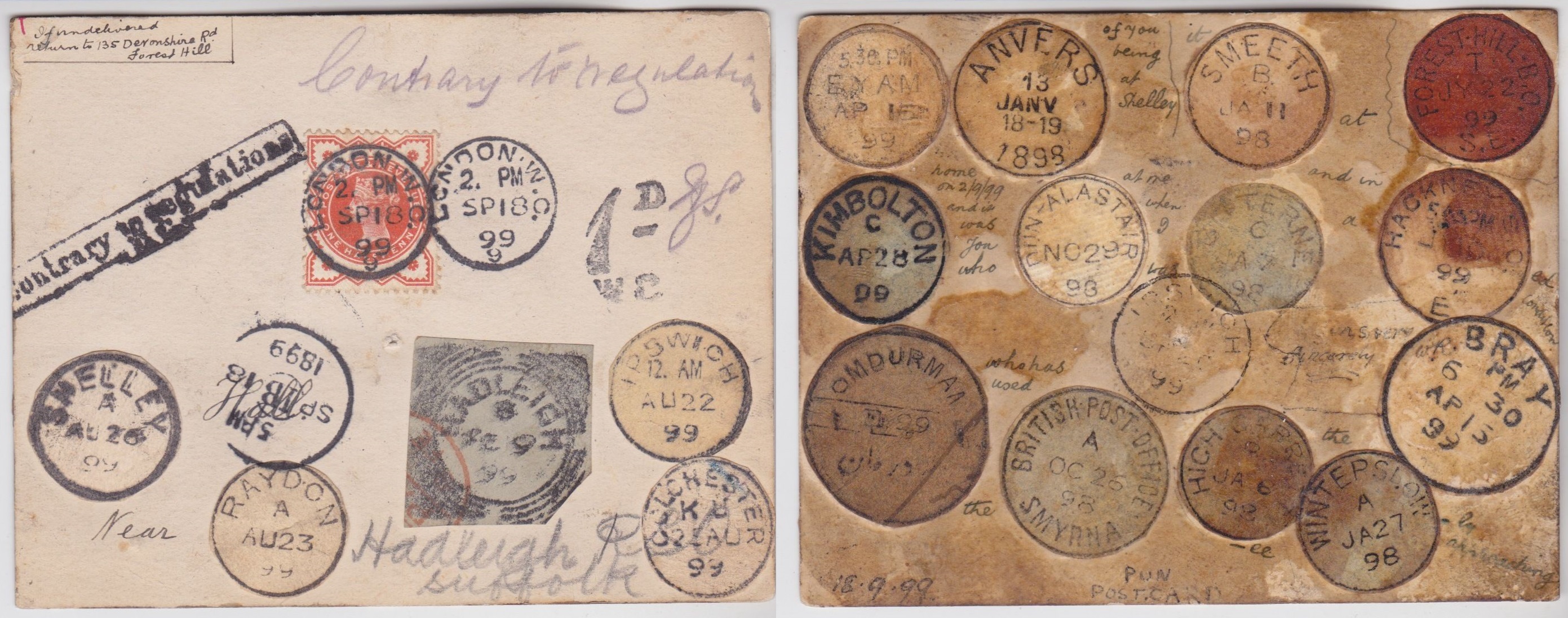 I managed to find out that there is not much left of Shelley Hall, and presumably there wasn’t at the time and Bray was expecting it to be undelivered (the Forest Hill return address is a give away for Bray’s philatelic curiosities). The message on the reverse continues with a mixture of cut-out postmarks and writing: “EY AM” “ANVERS” (I am envious) of you being at Shelley…” (prize of a pair of David Feldman tweezers to whoever can decipher the rest!).