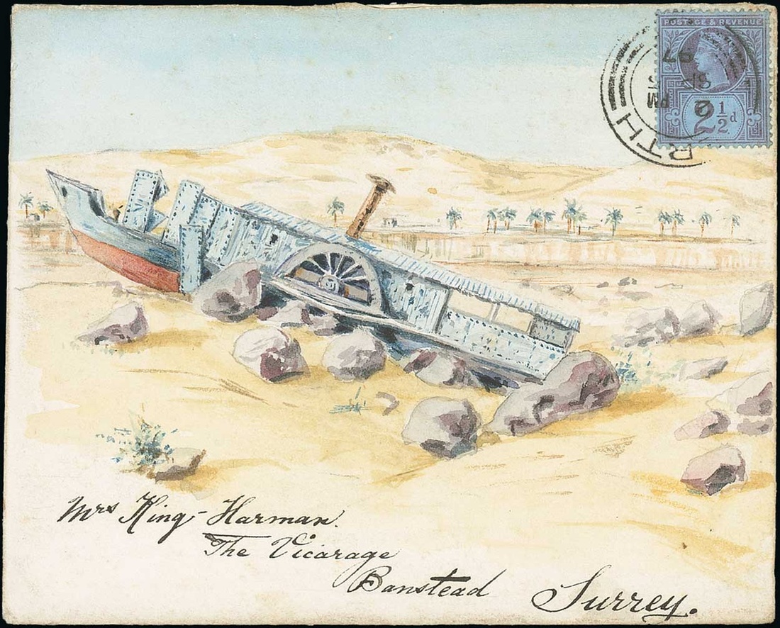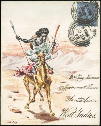 The envelopes were addressed to the wife of Sir Charles Anthony King-Harman, who (according to thepeerage.com) served as Colonial Secretary in Mauritius between 1893 and 1897 and Administrator of Saint Lucia from 1897 to 1900. The artist was Lt-Col Hugh Rose, 24th of Kilravock, CMG, who commanded the 1st Battalion Black Watch and fought in the Nile Expedition 1884-1885, the Boer War 1901-02 and WWI (again, according to thepeerage.com). According to the Siegel catalogue of the Grunin collection, Captain Rose developed a close relationship with the King-Harman family while he served as aide-de-camp to Charles King-Harman in Mauritius during the early 1890s.