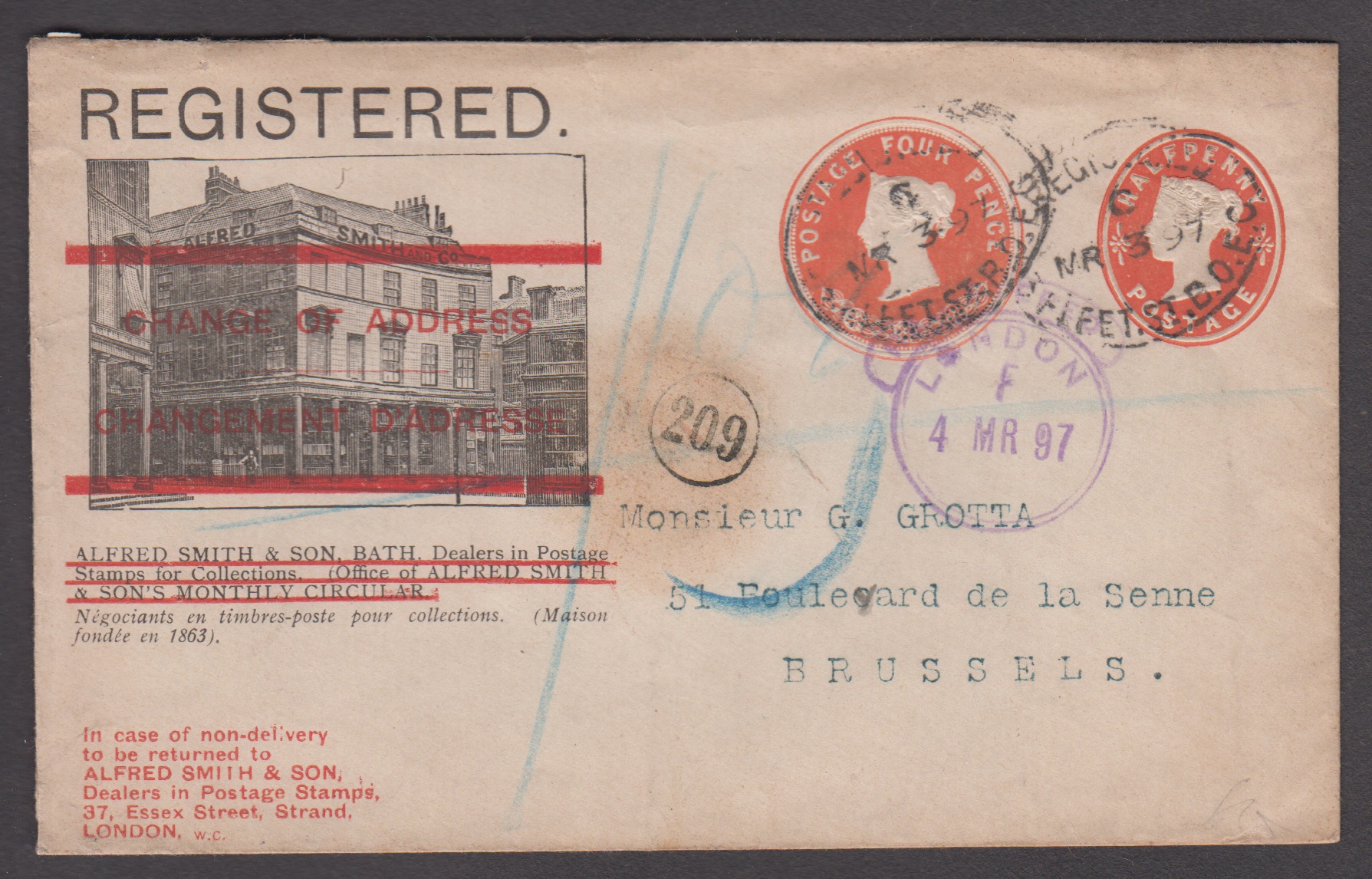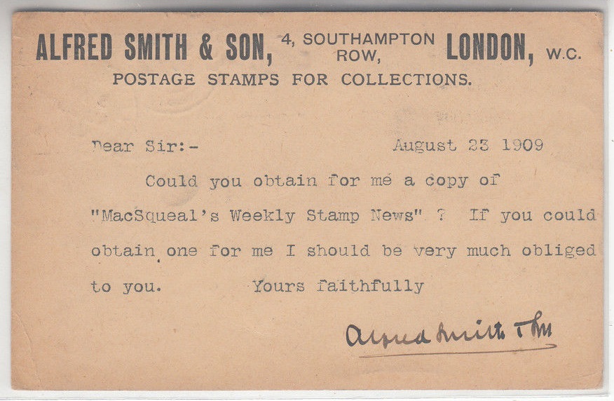 Alfred Smith (1837-1880) was one of the pioneer English stamp dealers who started trading in Bath with his brother Henry Stafford Smith (1843-1903) as partner, at 13 George Street. Together they published “The Stamp Collector’s Magazine”, one of the earliest philatelic magazines which ran from 1863 for 12 years. This was followed by the “Alfred Smith & Company’s Monthly Circular”. The partnership was seemingly dissolved when Henry moved to Brighton in 1866 where he established a new business and a new journal “The Philatelist” (1866-76).