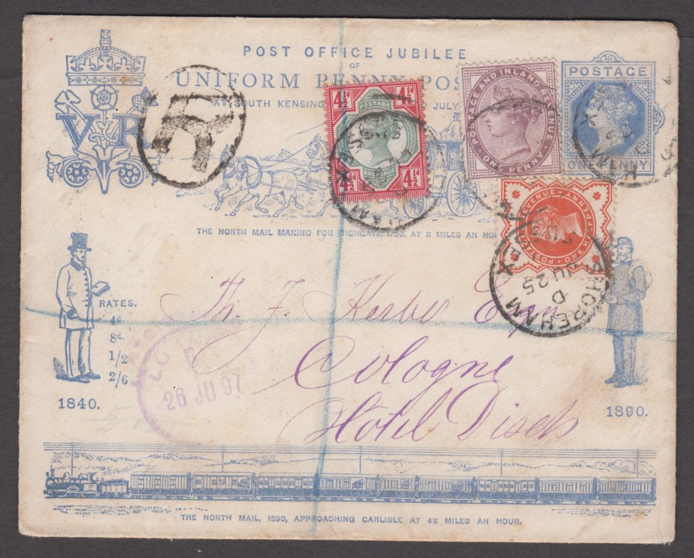 1897 (Jun 25) Penny Postage Jubilee envelope of 1890 sent registered to Germany uprated with 1881 1d lilac (SG.172), 1887 1/2d vermilion (SG.197) and 1892 4 1/2d green & carmine (SG.206), tied by Shoreham cds, Cologne arrival backstamp, including original insert with the same address written on it, minor soiling, fine