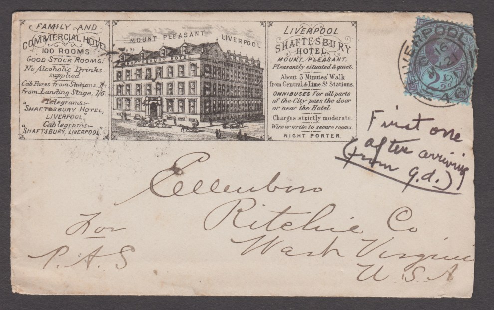 1891 (May 21) Advertising cover for Shaftesbury Temperance Hotel in Mount Pleasant, Liverpool, with 1887 2 1/2d Jubilee (faulty) tied by Liverpool “466” cds, sent to Ellenboro, Ritchie County, West Virginia, USA, with New York bs, including original contents with printed letterhead for the hotel with illustration of the hotel on the front and map on the reverse, fine and attractive