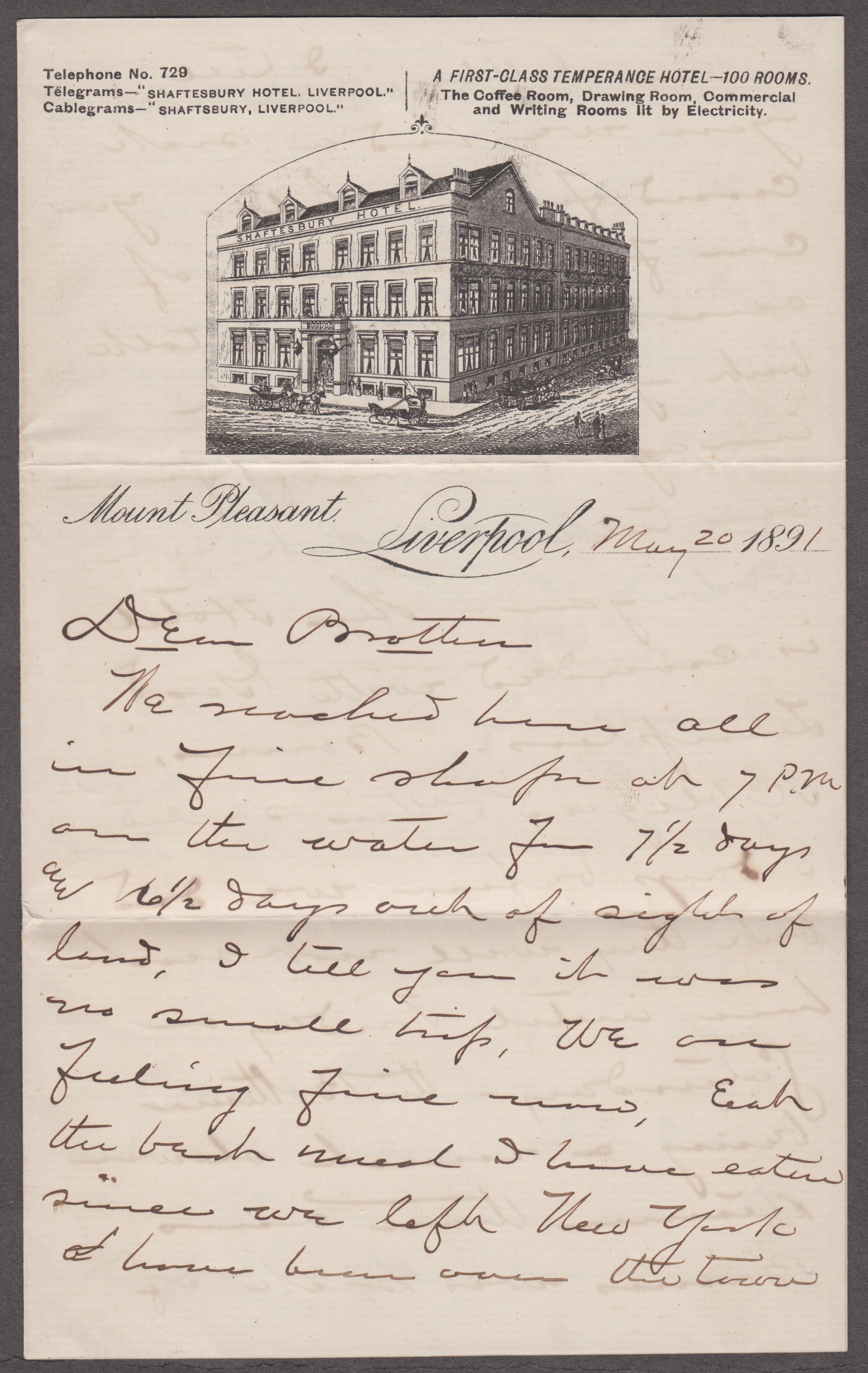 1891 (May 21) Advertising cover for Shaftesbury Temperance Hotel in Mount Pleasant, Liverpool, with 1887 2 1/2d Jubilee (faulty) tied by Liverpool “466” cds, sent to Ellenboro, Ritchie County, West Virginia, USA, with New York bs, including original contents with printed letterhead for the hotel with illustration of the hotel on the front and map on the reverse, fine and attractive