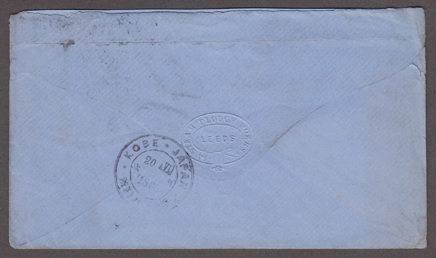 1893 (May 5) Envelope from Leeds to JAPAN with 1887 5d die II tied by Leeds “447” duplex, reverse with Kobe arrival cds, minor envelope faults, a scarce destination