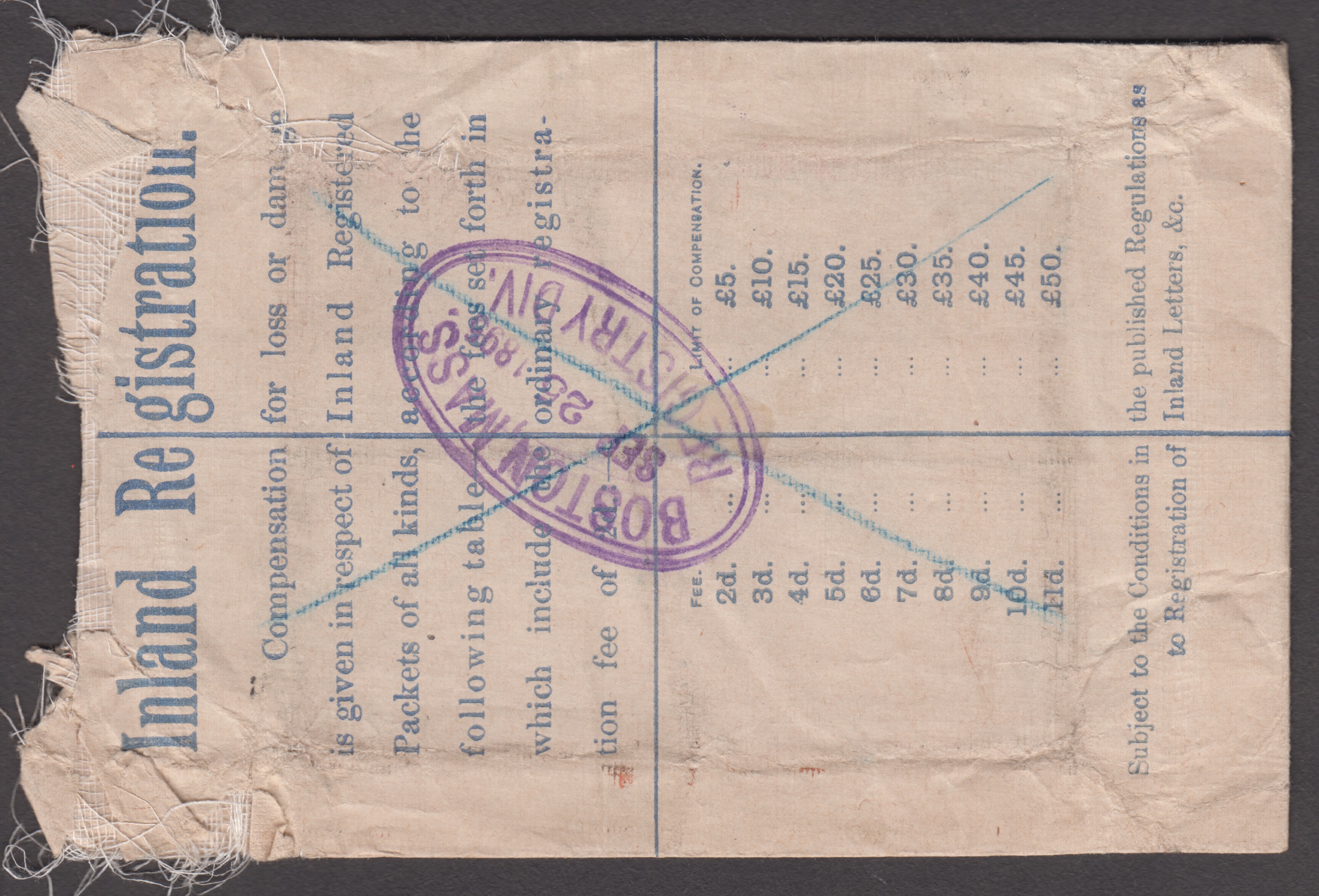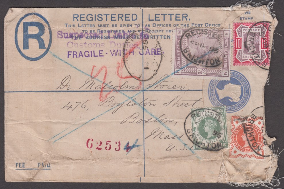 1895 (Sep 18) Registered envelope from Brighton to the USA with 1883-84 2s6d (pulled corner perf), 1887 1/2d (torn at right), 1s green and 1890 10d all tied by Brighton registered oval ds, Boston arrival backstamp, a rare usage of the 2s6d and attractive despite cover faults at right side