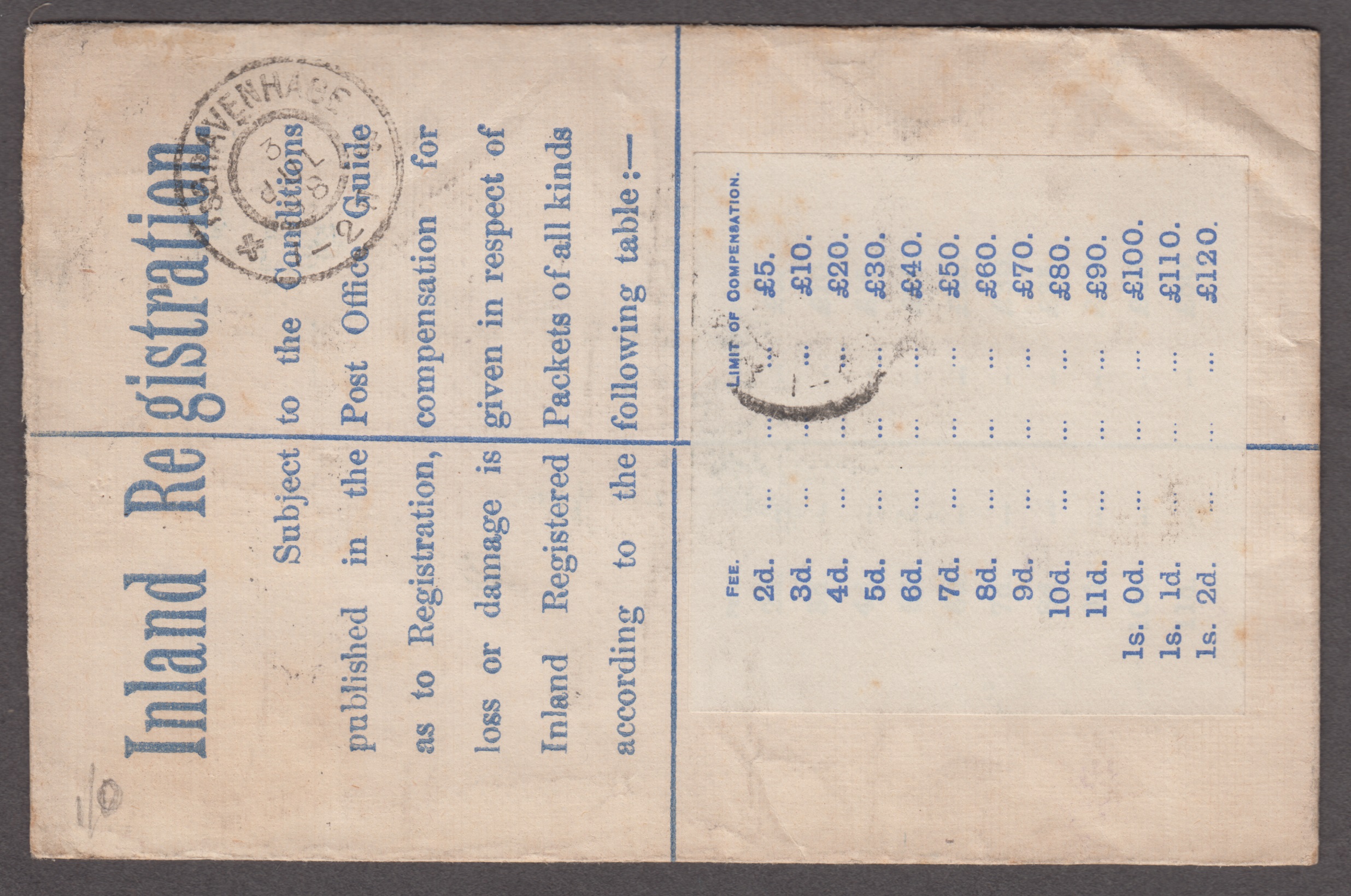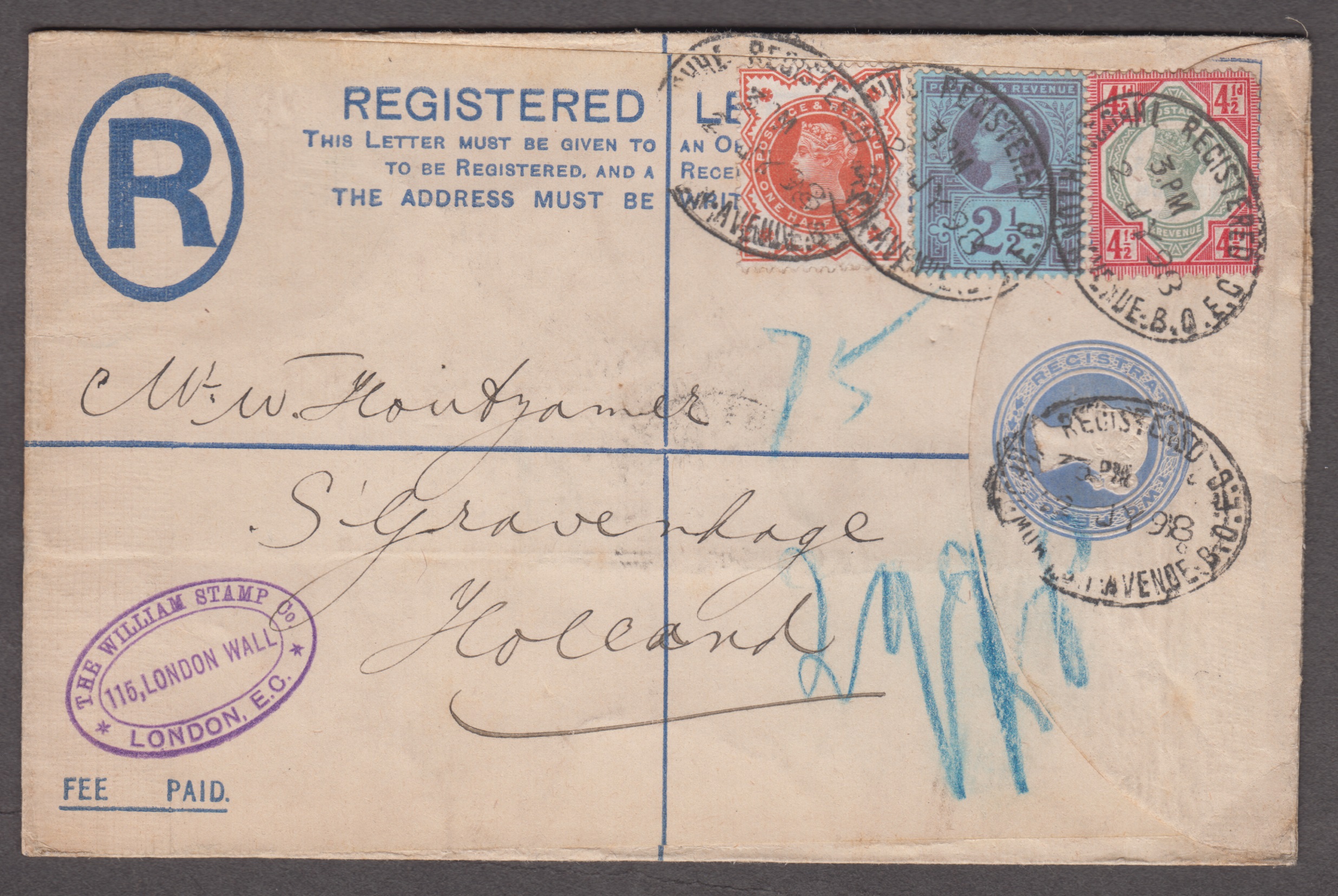 1898 (Jul 2) Registered envelope from London to the Netherlands with 1887 1/2d vermilion (SG.197), 2 1/2d purple on blue (SG.201) and 1892 4 1/2d red & green (SG.206) tied by Throgmorton Avenue registered oval ds, The Hague arrival backstamp, fine and scarce franking (stock code: 00471)