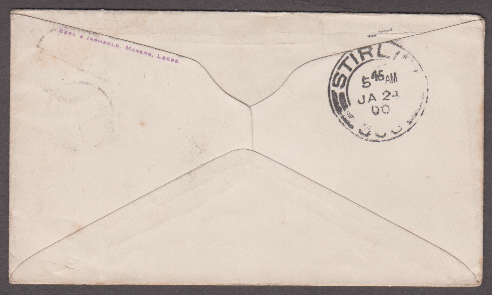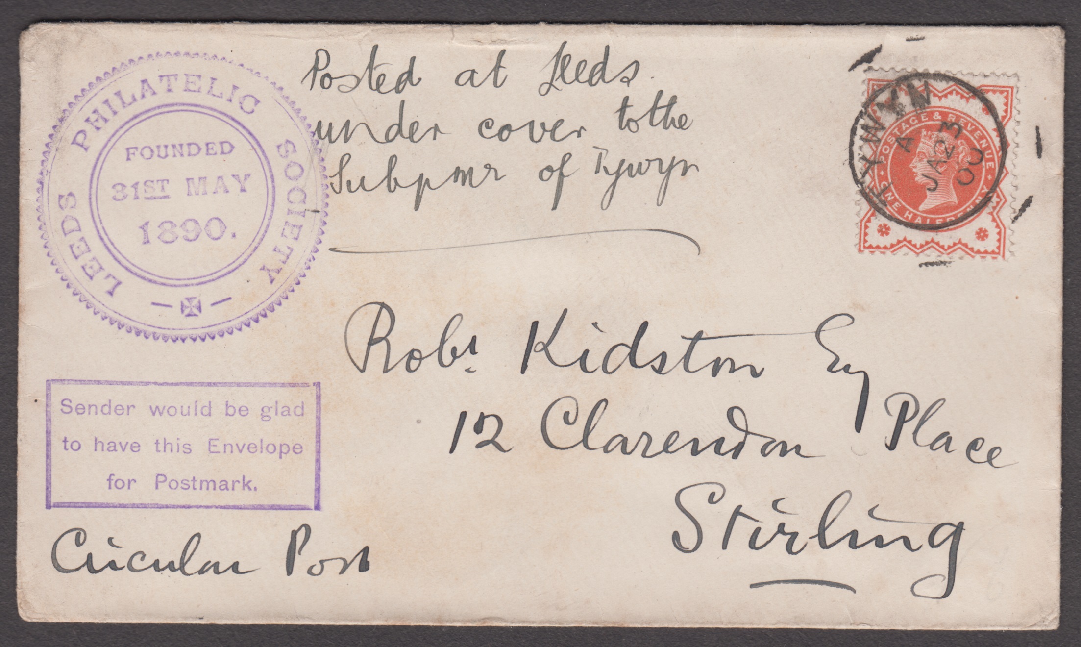 1900 (Jan 23) Envelope from the Leeds Philatelic Society, sent in a packet to Tywyn (Wales) to be put in the post there and delivered (in order to collect the cancellation), Stirling arrival bs, very fine and unusual