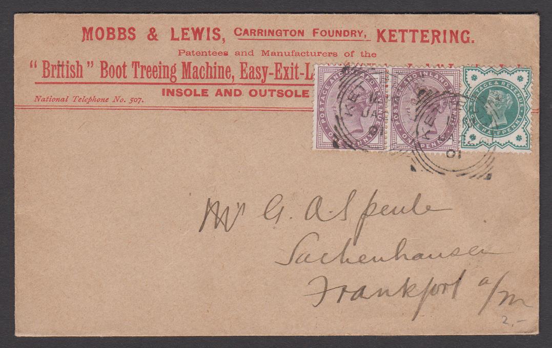 1901 (Jan 22, the day Queen Victoria died) Mobbs & Lewis Shoes advertising cover with 1881 1d lilac die II pair nd 1900 1/2d Jubilee tied by Kettering sqaured circle ds, with Frankfurt arrival backstamp, very fine