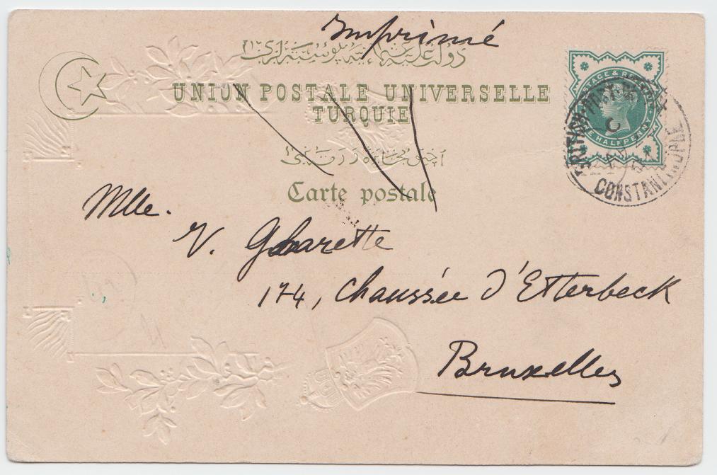 1901 (Apr 22) Postcard with GB 1900 1/2d green tied by Constantinople cds (25mm, code C), paying the 1/2d printed matter rate (note that “Carte Postale” is crossed out and “Imprimé” has been added in manuscript), sent to Belgium, a fine and scarce usage