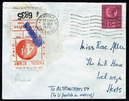 Finally, a very scarce single franking of the 4d green & brown, paying the 2d internal letter rate for up to 4oz in weight, plus 2d for the registration fee. It’s more regularly found on mail going to South America (before the rate was reduced to 2½d), on express covers, or uprating stationery. It only sold for £12.60 which is very cheap for such a scarce single franking, but it was another one I forgot to bid on before it was too late.