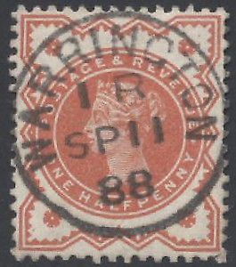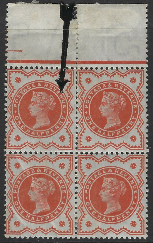This ½d vermilion block of four may not look like much, but to a specialist/nutter like me, I get quite excited about this sort of thing. The big black arrow is slightly misleading because it’s pointing at the wrong thing, but there is in fact a major plate flaw on the top left stamp, which shows a crack which starts in the “Jubilee” line, continues through the “T” of “POSTAGE” and continues through the “E” of “ONE”. It is the variety listed in the SG Queen Victoria Specialised catalogue as K27j. It’s a very scarce variety and even with the lower stamp creased it’s worth considerably more than the £8.45 it sold for.