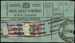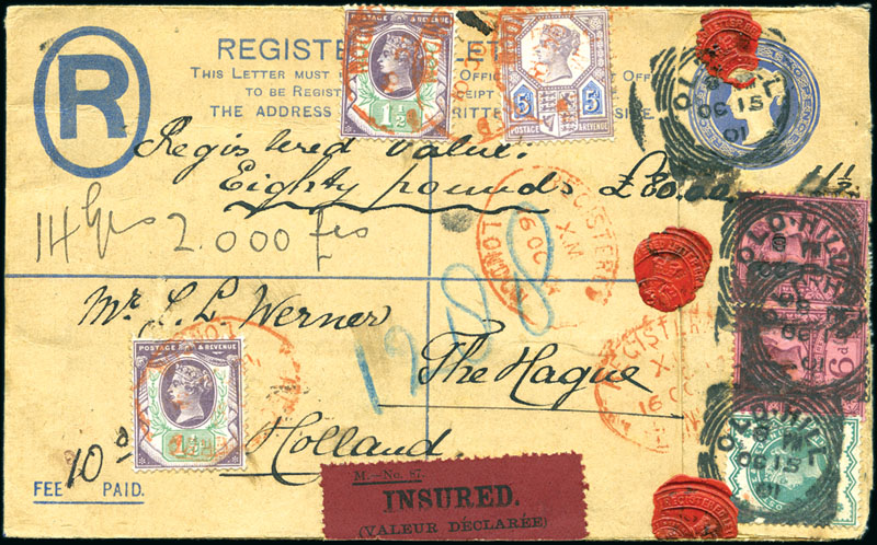 And lot 2126 in Cavendish’s December 6th auction was a group of Boer war covers which included a scarce 1s green & carmine franking with two examples along with a 5d pair on a cover (the 83rd cover I have recorded with a 1s green & carmine franking). It realised £480 plus commission.