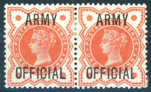 Controls on the Army Official 1/2d vermilion are popular but not particularly scarce. It is much harder to find items such as the one above with the complete bottom three rows of the sheets. It’s of particular interest to the specialist as with the date cuts in the marginal “Jubilee” line one can identify the printing and the link it to any associated varieties (the first stamp has a short arm to Y for instance). It sold for £306.50.