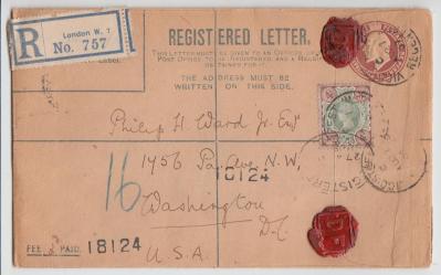 Another combination with Edward VII, but this time it’s a single use of the 4d Jubilee to uprate a 1d + 2d registration envelope to pay double the UPU rate to the USA in 1907. It sold for only £4.10 but I think it’s unusual combination.