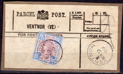 This parcel post label is a scarce single usage of the 9d purple and blue. In unusually fine and attractive condition for a parcel label, it was no surprise to see this sell for £68.80.