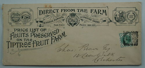 Another attractive 1900 1/2d franking was this advertising cover for Tiptree Fruit Farm. Advertising covers are very collectable, and the more ornate they are, the more desirable they are. This one fetched an impressive £82.51.