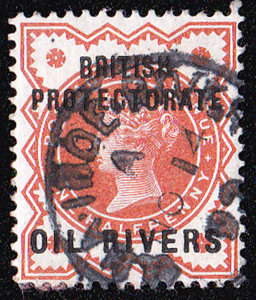 An area I haven’t explored too closely are the cancellations on the Niger Coast Protectorate issues. The first one on the left is a very scarce Bakana oval ds, and the third one, a Warri rubber parcel cancel is also not common. The group sold for £36.15.