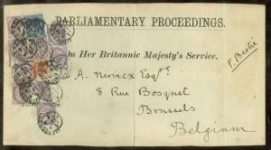 This month sees another Jubilee item slip through my fingers. Although only a large parcel piece, it has added interest in the fact that it was sent from the Houses of Parliament, and is printed “PARLIAMENTARY PROCEEDINGS / On Her Britannic Majesty’s Service”. Sent to Belgium, it is franked by nine 1881 1d lilacs, a 1887 1/2d and a 2 1/2d tied by London hooded cds. Hosted on ebay.com, it sold for £21.75.