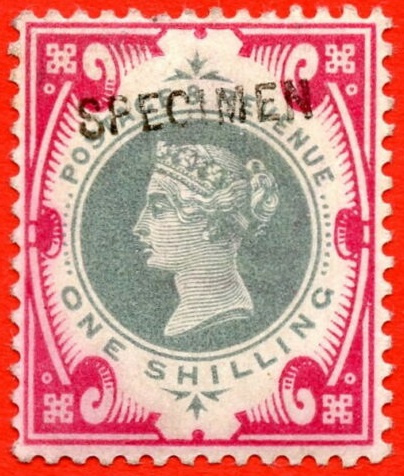 The type 15 SPECIMEN on the 1900 1s green and carmine is catalogued by Stanley Gibbons at . This one, described as having small faults, with no explanation or scan of the reverse, sold for only £20… I think, not just because it was poorly described, but because it is a fake specimen overprint. There’s two or three discrepancies in the appearance of the shape of the letters when compared to the reasonably common 10d with type 15 specimen overprint (the curvature of the “S”, the central point of the M descends all the way to the baseline). But I’m not an expert. I had somebody recently just point out two Specimen forgeries in my collection that I’ve had since I first started collecting Jubilees, and never thought to question them as when I looked at the time they were identical to the illustrations in the SG catalogue. Unfortunately I’ve come to realise that the illustrations are misleading and should be corrected!