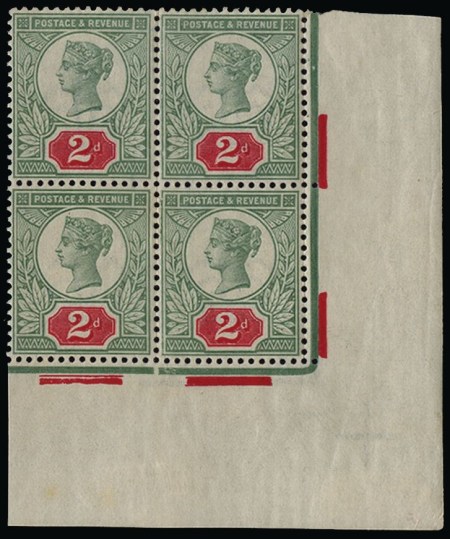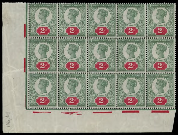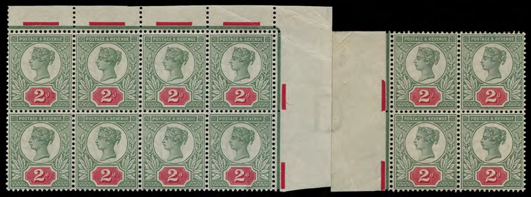 Continuous red and green rules around each pane (red rules broken every three stamps horizontally and five vertically)