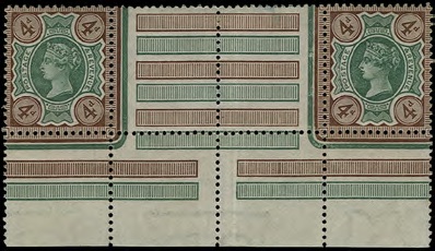 Pane A from the right mill sheet, showing cut to the head rule above R1/2 (see Wiseman’s “The De La Rue Years, Volume 2” pp.346-348)