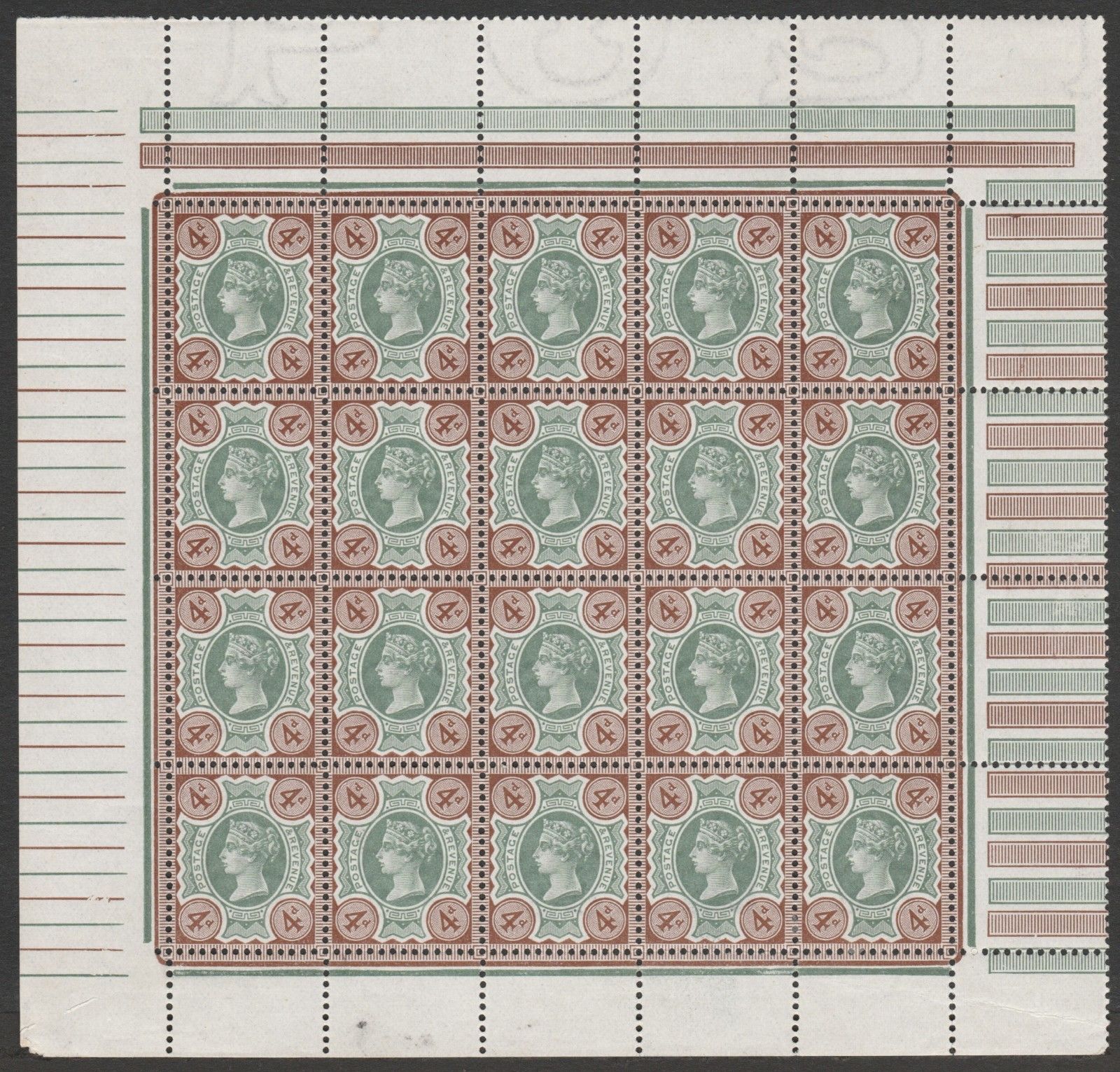 With lined blocks, continuous rules and thin green and brown lines added to sheet margin between the left and right halves of the 320 Mill sheet. These distinctive markings only affect eight of the sixteen panes and only sixteen of the sixty four corners on the 320 mill sheet.