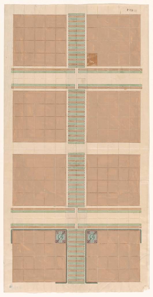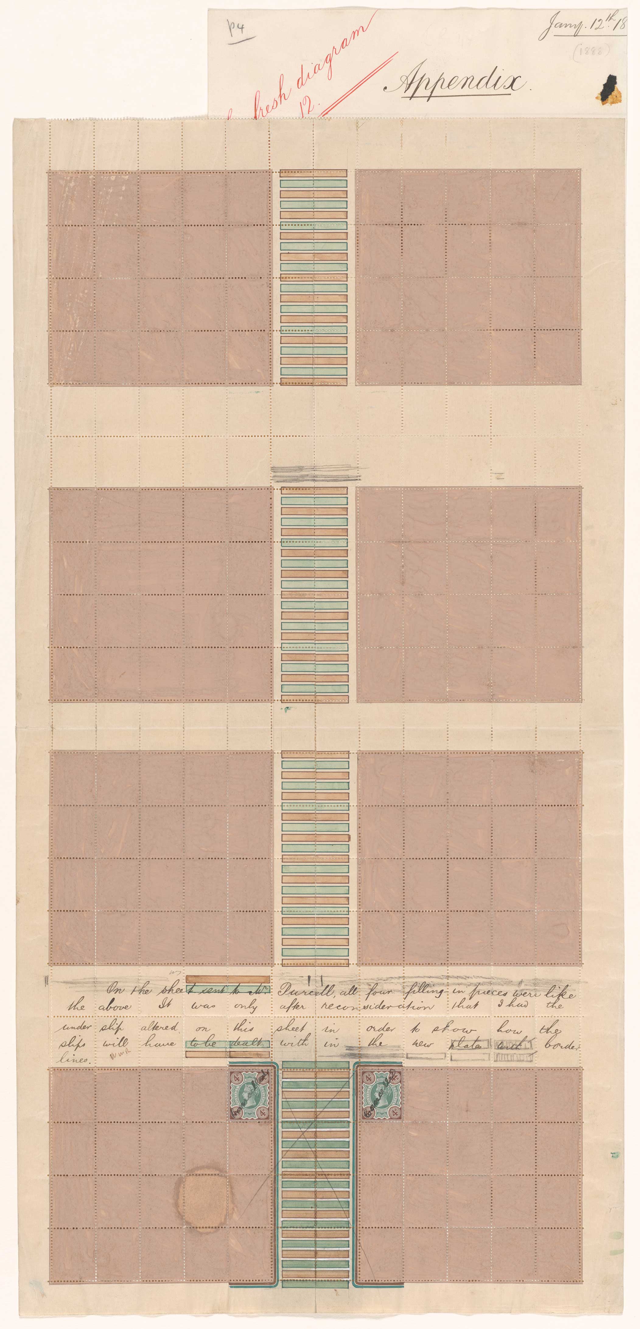 Dated 12th January 1888. Dummy sheet produced by De La Rue to illustrate amendments to their first proposal for the layout of the 160-set printing plate. The perforated sheet shows eight light brown watercolour painted panels (indicating four rows of two panes, each comprising 4 rows of 5 stamps). Between each of the top three pairs of panels are short horizontal blocks. There is one stamp in G pane and one in H, both defaced with manuscript “Cancelled”. G and H panes also show the continuous marginal rules in green and brown as well as coloured bars just below pane E and above pane G. Pencil markings show the intention to continue these lines, either continuously or broken, along the edge of the panes and even that these blocks might be made up of vertical lines. Above panes G and H is the following manuscript: “On the sheet sent to W. Purcell, all four filling in pieces were like the above. It was only after reconsideration that I had the under slip altered on this sheet in order to show how the slips will have to be dealt with in the new plates with border lines”