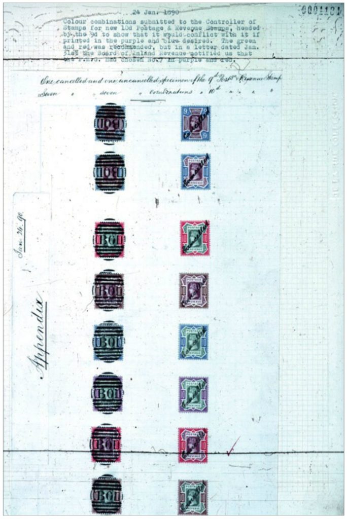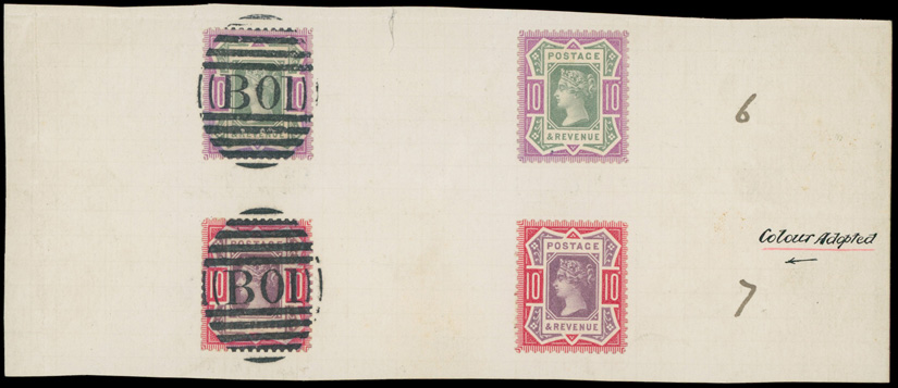 Trials for determining the colours of the 10d, on white paper, watermark Crown, line perf. 14