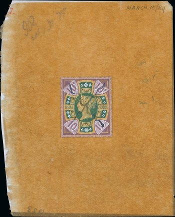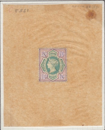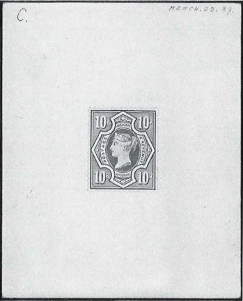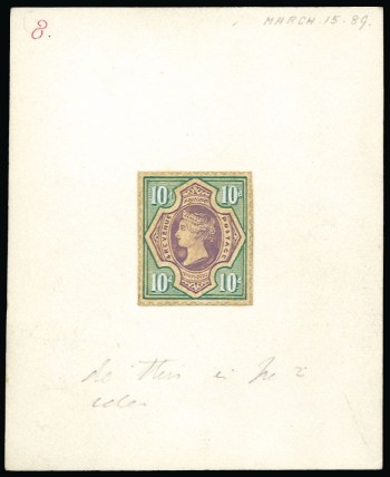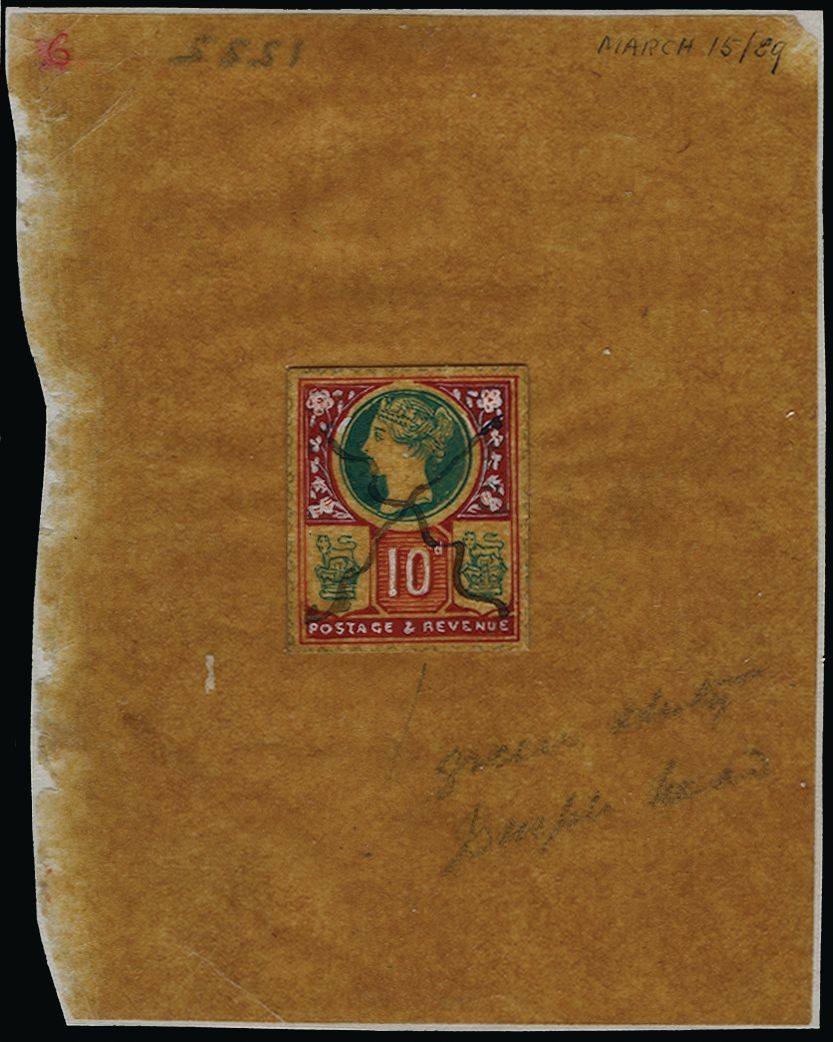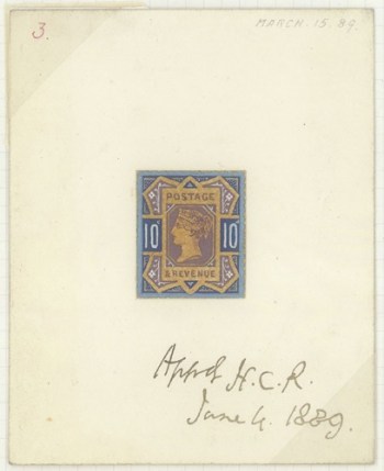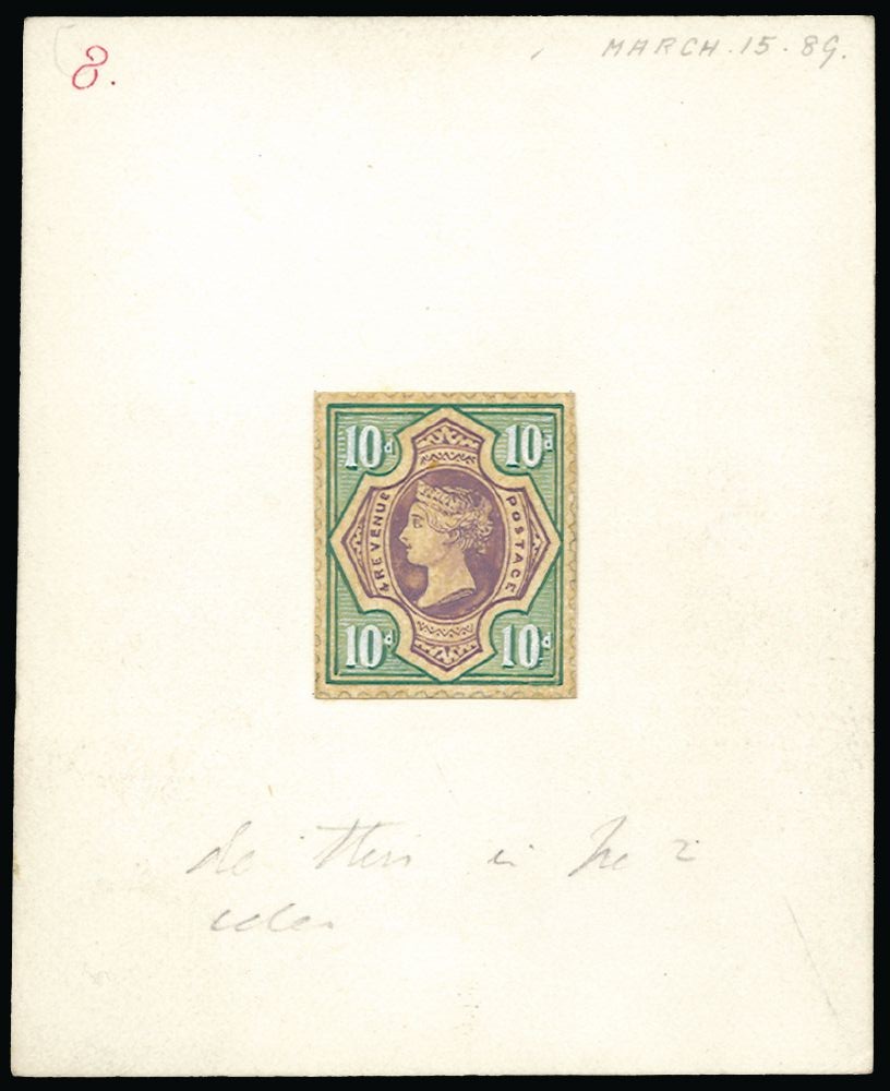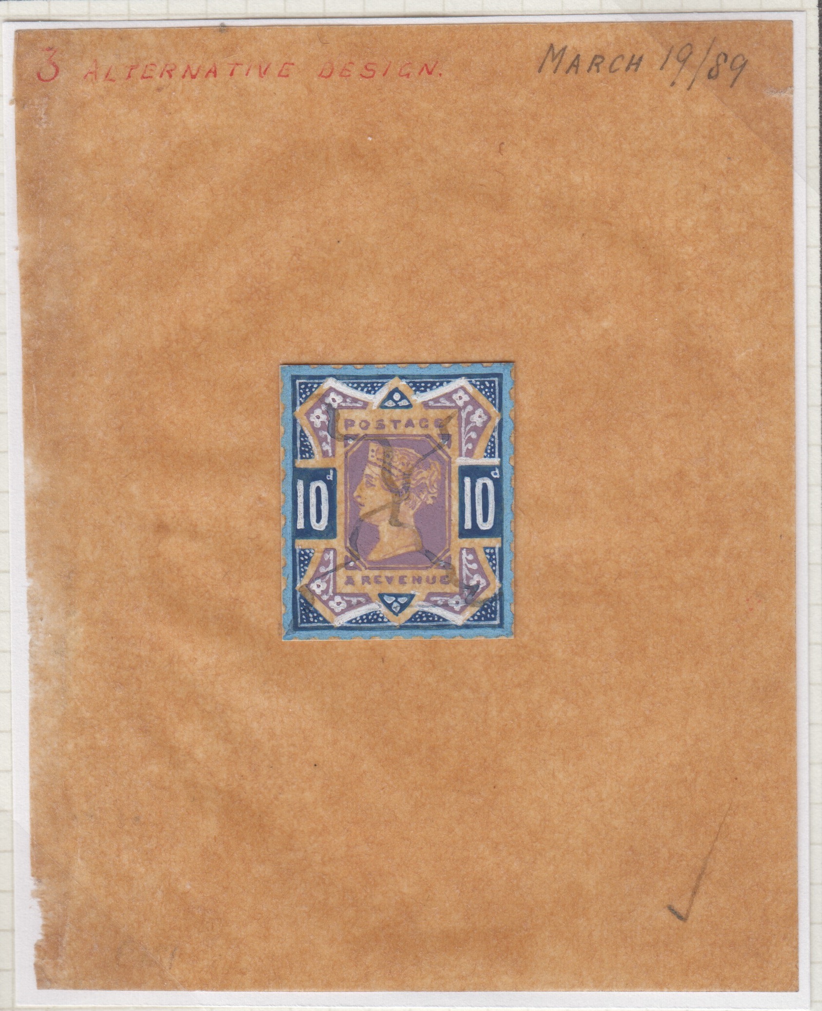 De La Rue were asked verbally in March 1889 by J. S. Purcell to produce essays for the design of the 10d and they submitted ten hand-painted, each on card numbered 1 to 10, on 15th March to Somerset House.