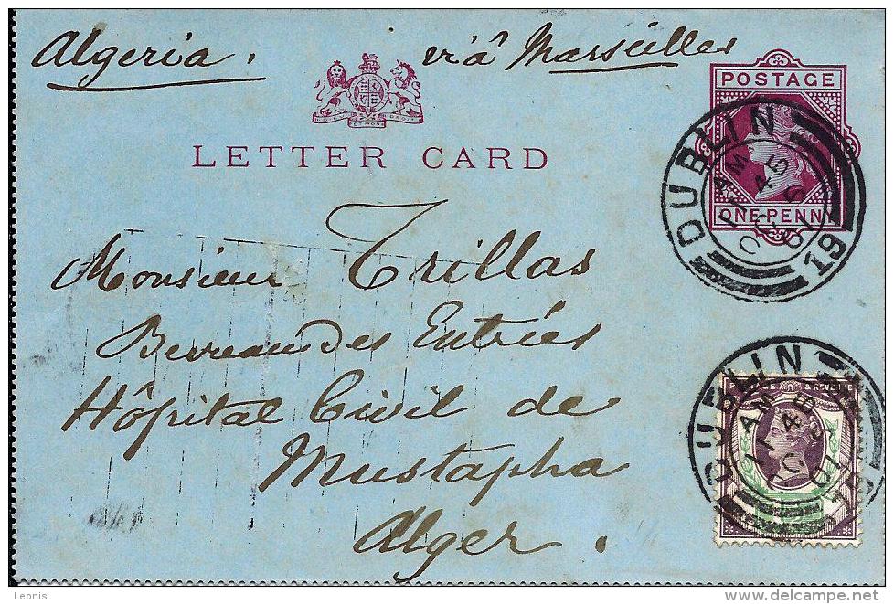 1901 (Oct 6) 1d Letter card uprated with 1 1/2d from Dublin, Ireland, to Algeria, with Marseille and Mustapha backstamps