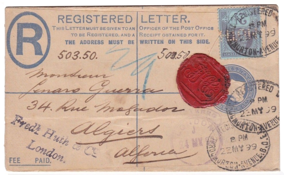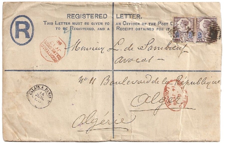 1899 (May 23) Registered envelope with 1887 2 1/2d Jubilee sent to Algiers