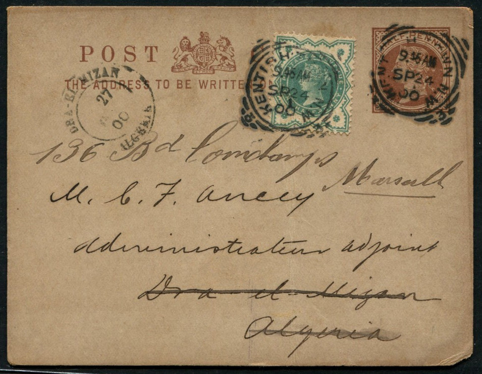 1900 (Sep 24) 1/2d postal stationery card uprated with 1900 1/2d blue-green to Algeria with Draâ El Mizan arrival cds