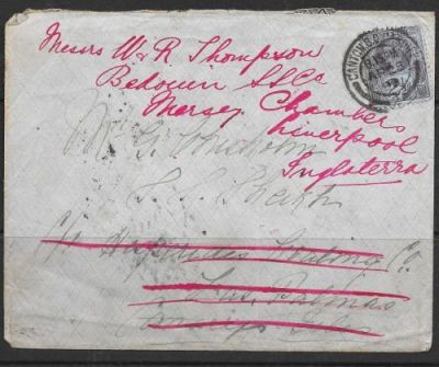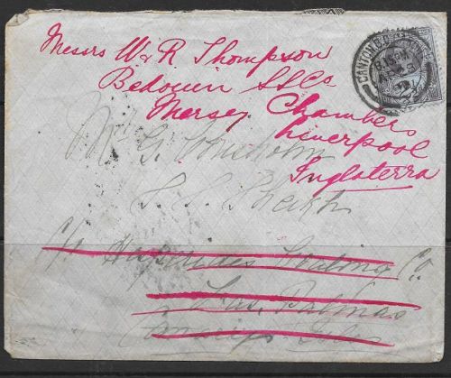 1898 (Apr 28) Cover to Gran Canaria with 1887 2½d tied by Canton, Cardiff cds, redirected to Liverpool, reverse with Gran Canaria, Plymouth Ship Letters and Liverpool cds