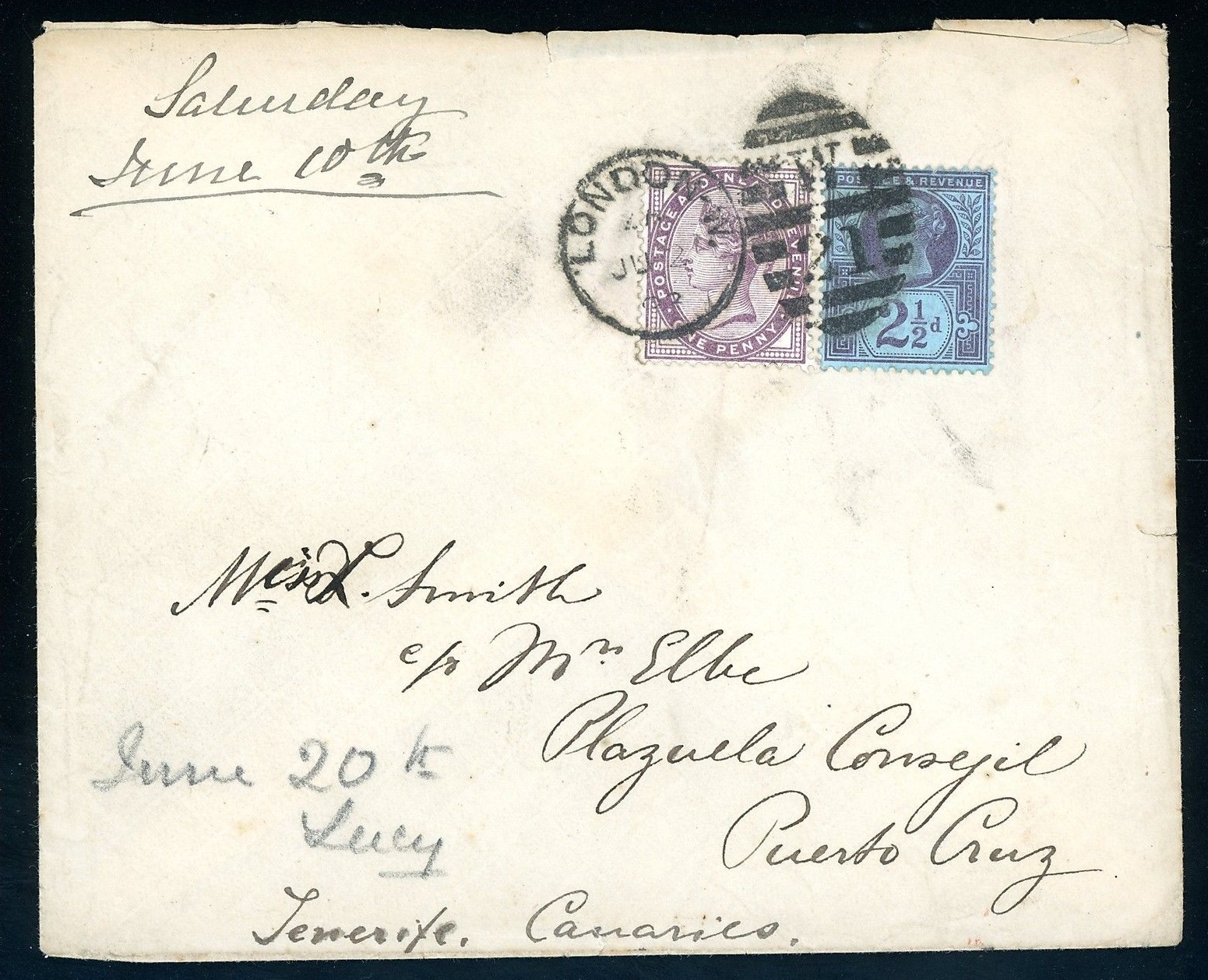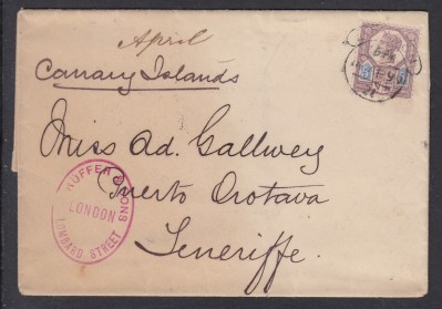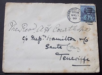 1900 (Mar 27) Cover to Tenerife with 1887 2½d tied by Tunbridge Wells “820” duplex