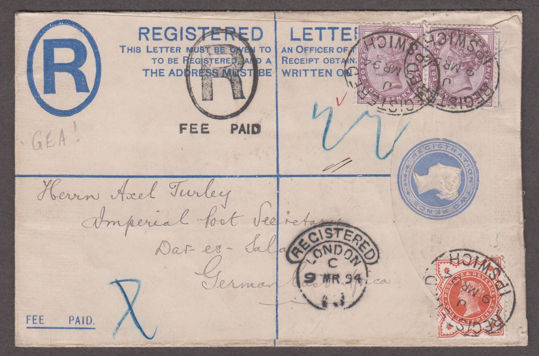 1894 (Mar 9) Registered envelope sent to Dar-es-Salam, German West Africa (modern day Tanzania) with 1881 1d lilac die II and 1887 1/2d vermilion tied by Ipswich registered oval ds, reverse with Aden and arrival cds