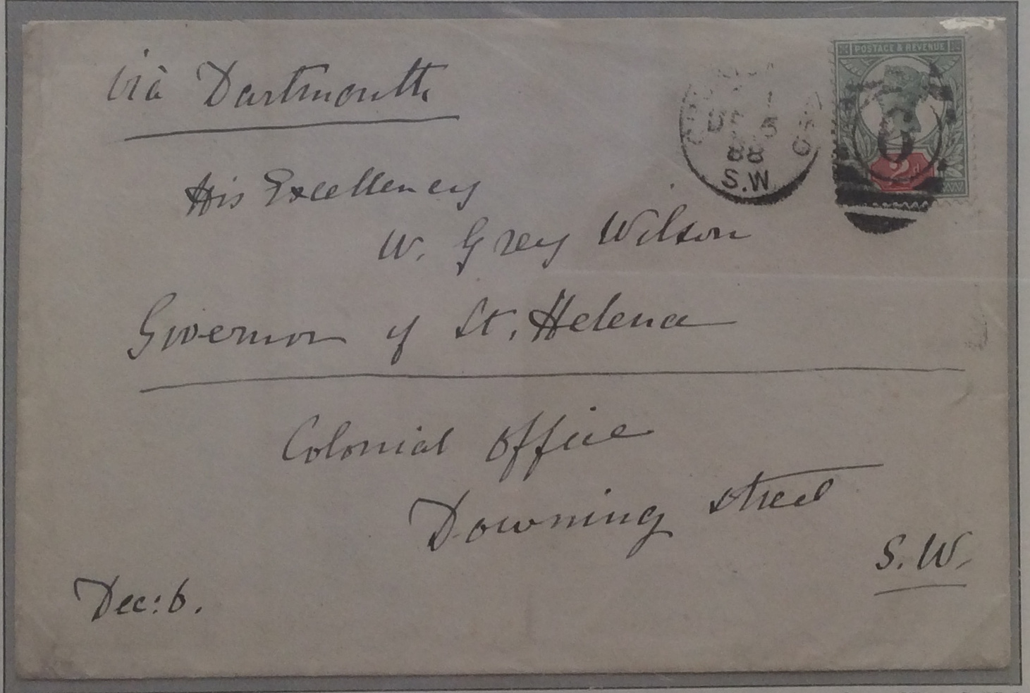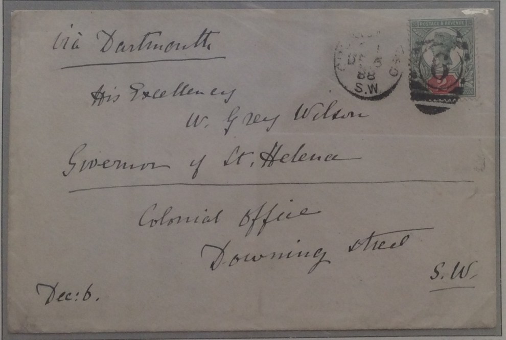 1888 (Dec 6) Envelope from London to St. Helena via the Colonial Office and carried by diplomatic mail bag to the Colonial Secretary William Grey-Wilson