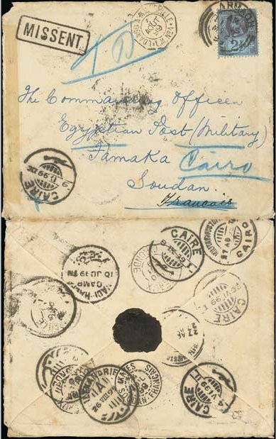1899 (May 26) Envelope from Armagh, Ireland, with 1887 2 1/2d Jubilee, sent to the Commanding Officer of the Egyptian Post in Famaka, Sudan, initially sent to Wadi Halfa, then redirected to French Sudan then to Cairo, France and back to Egypt, opened for display