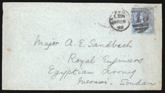 1898 (Mar 2) Envelope sent from Aldershot to Major Sandbach in the Royal Engineers in the Egyptian Army in Merawi, Sudan