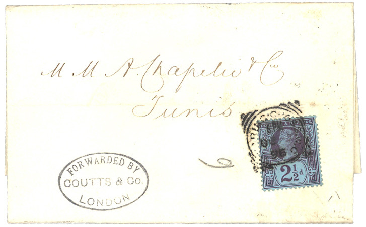 1895 (Oct) Entire from London to Tunis with 1887 2½d tied by Charing Cross squared circle ds, “FORWARDED BY / COUTTS & Co.” / LONDON” cachet at lower left, Marseille and Tunis arrival bs