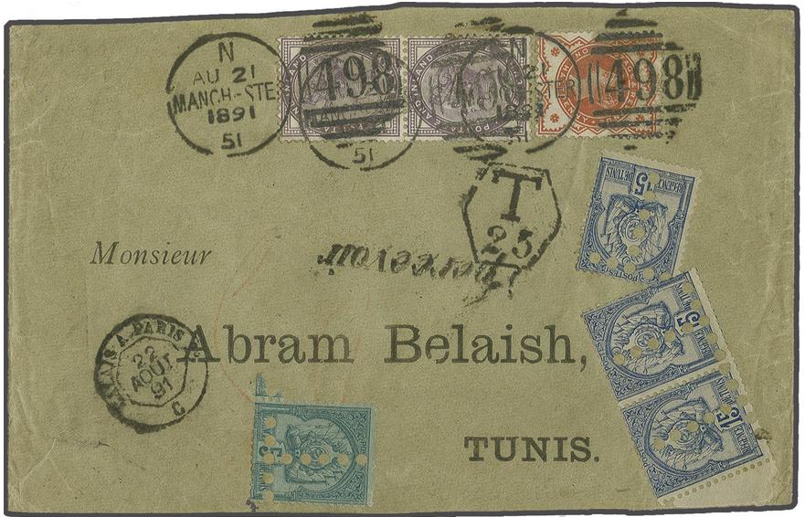 1891 (Aug 21) Cover from Manchester to Tunis with 1881 1d lilac die II vertical pair and 1887 1/2d vermilion, underpaid with British “T/25” and Tunisian “percevoir” hs and franked with 50c of Tunisian postage dues