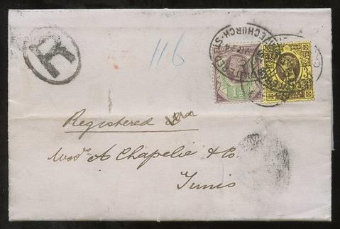 1894 Cover sent registered from London to Tunis with 1887 1½d and 3d tied by Gracechurch St. registered oval ds