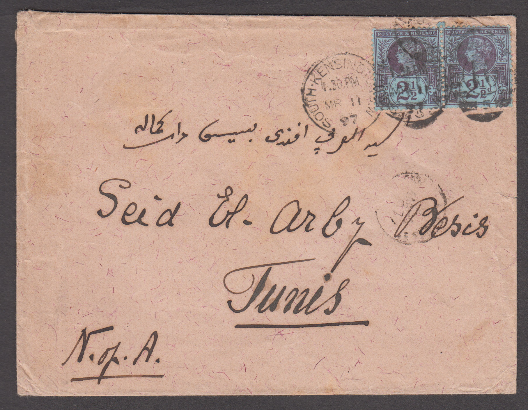 1897 (Mar 11) Envelope from London to Tunis with 1887 2½d pair tied by South Kensington duplexes, Tunis arrival backstamp