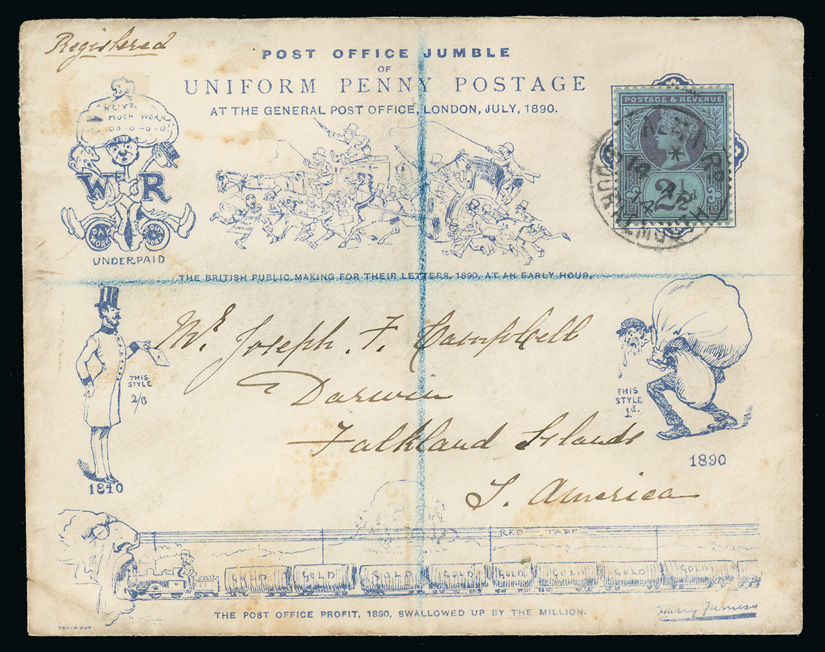 1914 (Apr 14) Harry Furniss Uniform Penny Post Jubilee cover caricature with 1887 2 1/2d and KGV 1/2d sent to the Falkland Islands