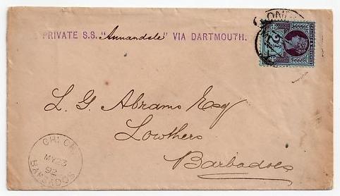 1892 (May) Envelope from London with 2 1/2d, Chica / Barbados arrival cds below