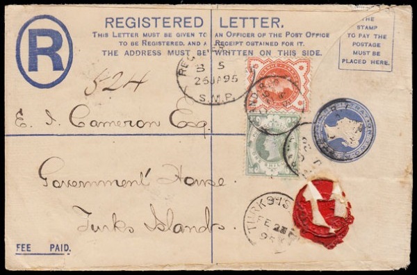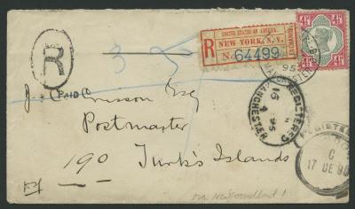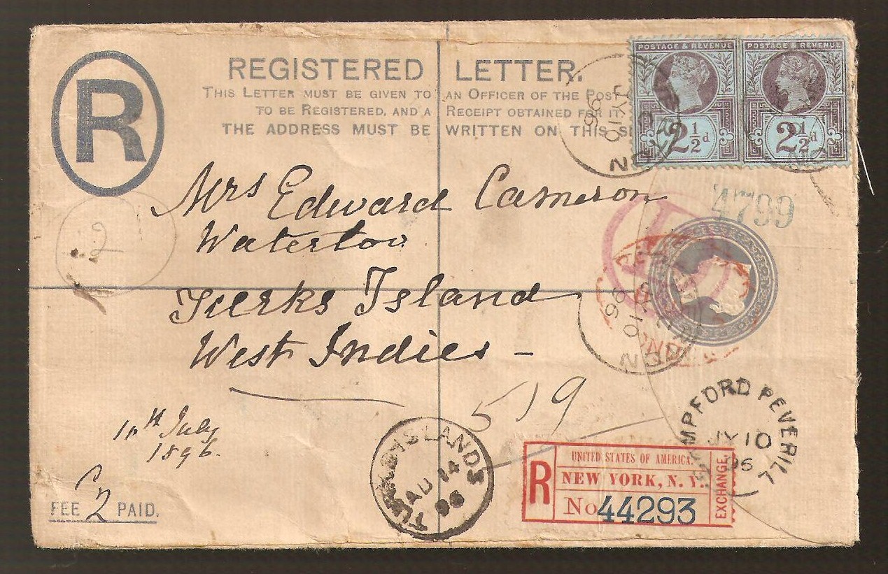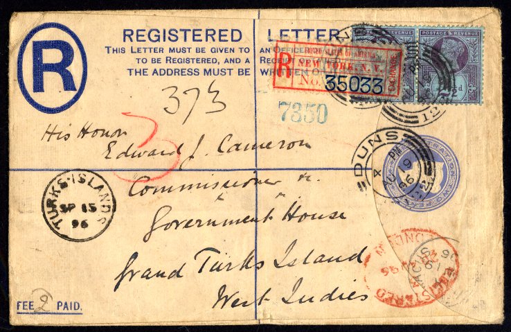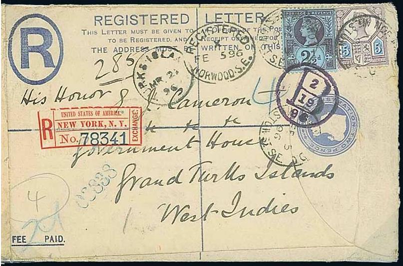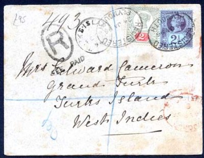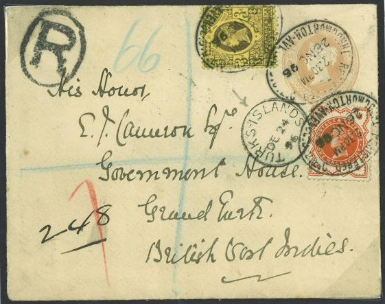 1896 (Jan 24) Envelope sent registered from Plymouth to Grand Turk, with 2d and 2 1/2d tied by Plymouth registered oval ds, paying the 2 1/2d letter rate plus 2d registration fee, Halifax Nova Scotia transit on reverse, Turks Island arrival adjacent.
