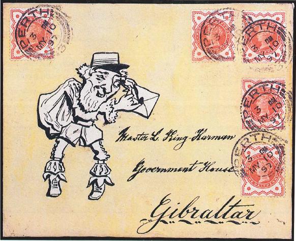 1897 (May 10) Envelope from Perth to King-Harman in Gibraltar with five 1/2d vermilions and an illustatration of a nosey postman